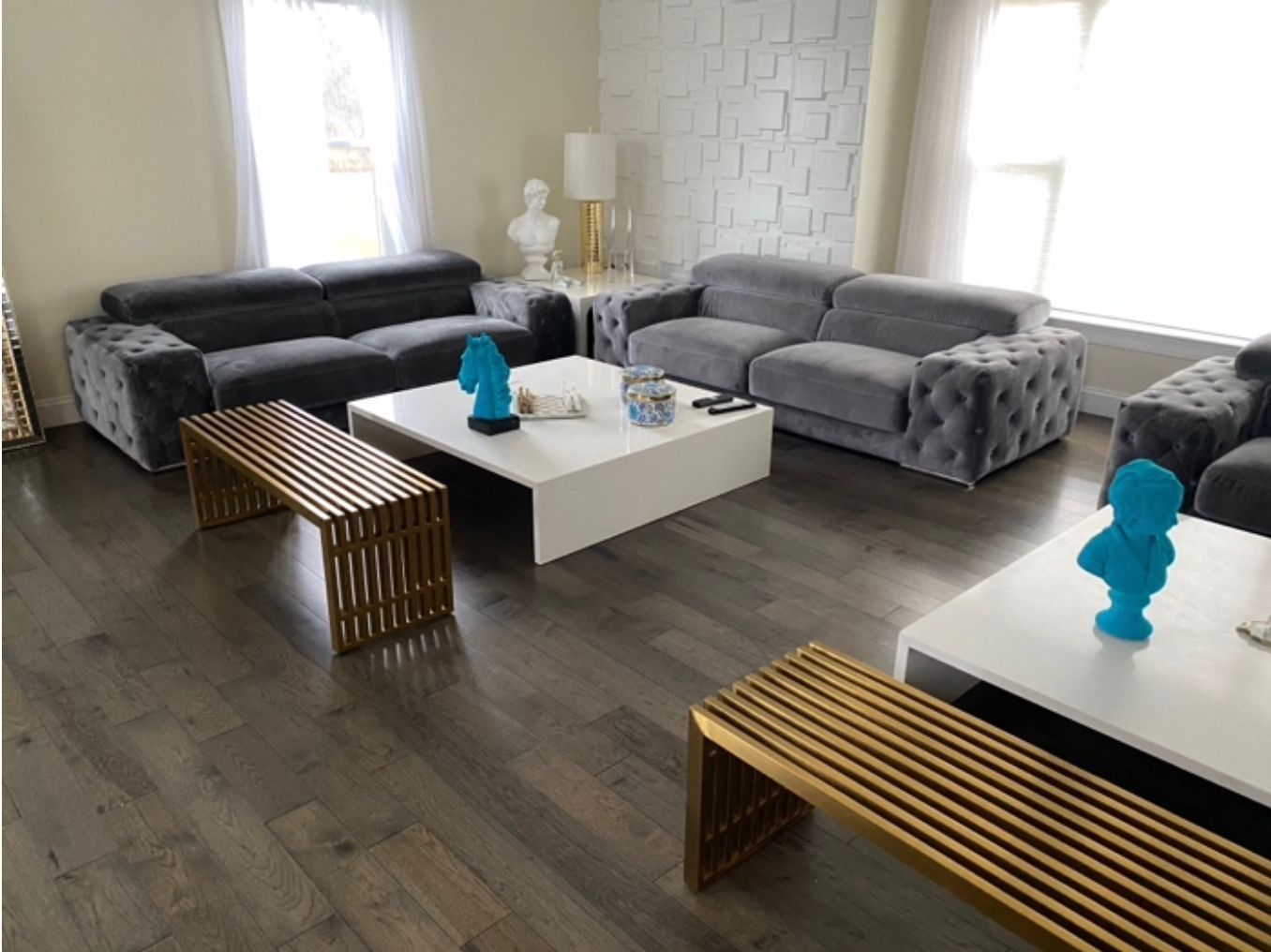 Incredible home featuring Contemporary European and Middle Eastern items including sofas, sectionals, formal dining tables, artwork, marble parsons tables, unique glass top coffee tables and side tables, hides and rugs, collectibles, lamps, kitchenware, etc.